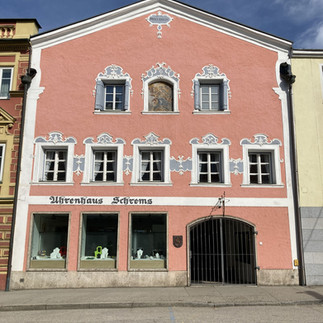 Wir beginnen unsere Wanderung am Marktplatz, einem typischen Straßenplatz der Inn-Salzach-Gegend. Das schönste Haus am Marktplatz ist das Haus des Uhrmachermeisters Alfons Schrems. Der schöne Stuck, der die Fassade ziert, stammt aus der Hand des in dieser Gegend bekannten Johann Michael Vierthaler, aus dem Jahre 1734.